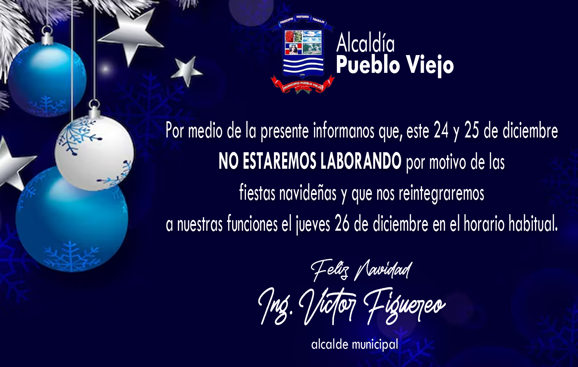 Por medio de la presente informamos que, este 24 y 25 de diciembre NO ESTAREMOS LABORANDO por motivo a las fiestas navideñas y que nos reintegraremos a nuestras funciones el jueves 26 de diciembre en el horario habitual.